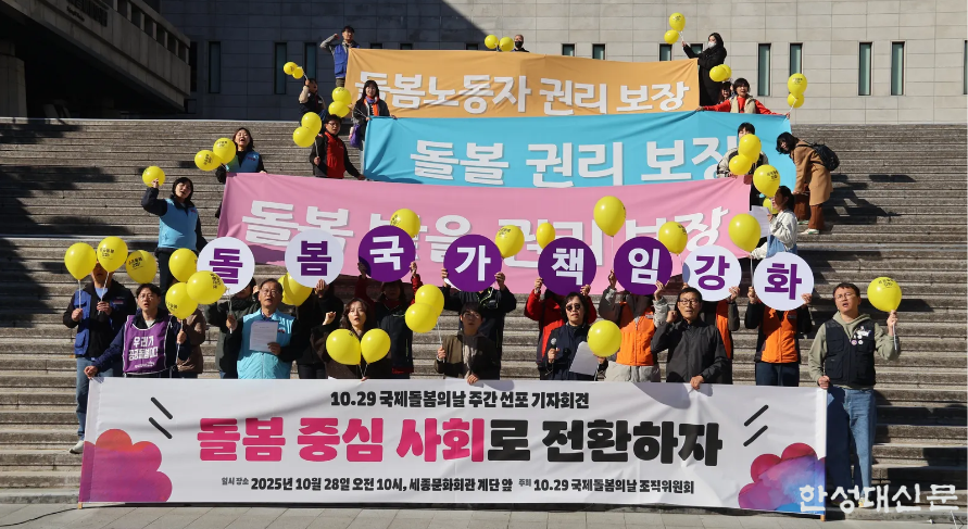 국제돌봄의날을 맞아 돌봄 사회를 요구하는 기자회견이 지난 28일 세종문화회관 앞에서 열렸다. 10.29 국제돌봄의날 조직위원회는 ’돌봄도 하나의 권리라며, 공공성을 강화해야 한다고 주장했다. 돌봄의 책임이 개인에게만 전가되면, 돌봄과 생계를 동시에 감당해야 하는 이중고에 부딪힐 수밖에 없다. 돌봄 받을 권리를 넘어 ‘돌볼 권리’마저 박탈당하는 것이다. 그러나 현재는 일부 대상에게 선별적으로 돌봄을 제공하는 데 머물러 있다. 돌봄의 짐이 개인의 몫으로 남지 않도록 사회 전체가 함께 돌봄을 책임질 때다.