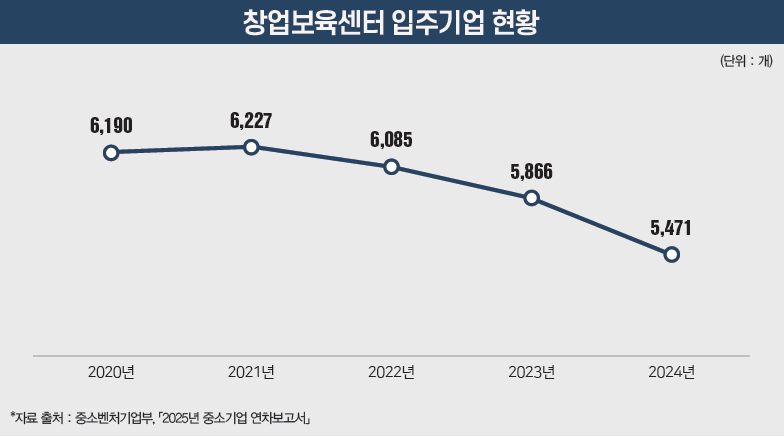 이 같은 취지에도 불구하고 BI 운영 부실로 인해 입주 기업은 대폭 감소하고 있다. 중소벤처기업부의 「창업보육센터 입주기업 현황」 통계에 따르면, BI에 입주한 창업 기업은 2020~2022년까지 6,000여 곳에 달했으나, 2024년 5,471곳으로 줄었다.
