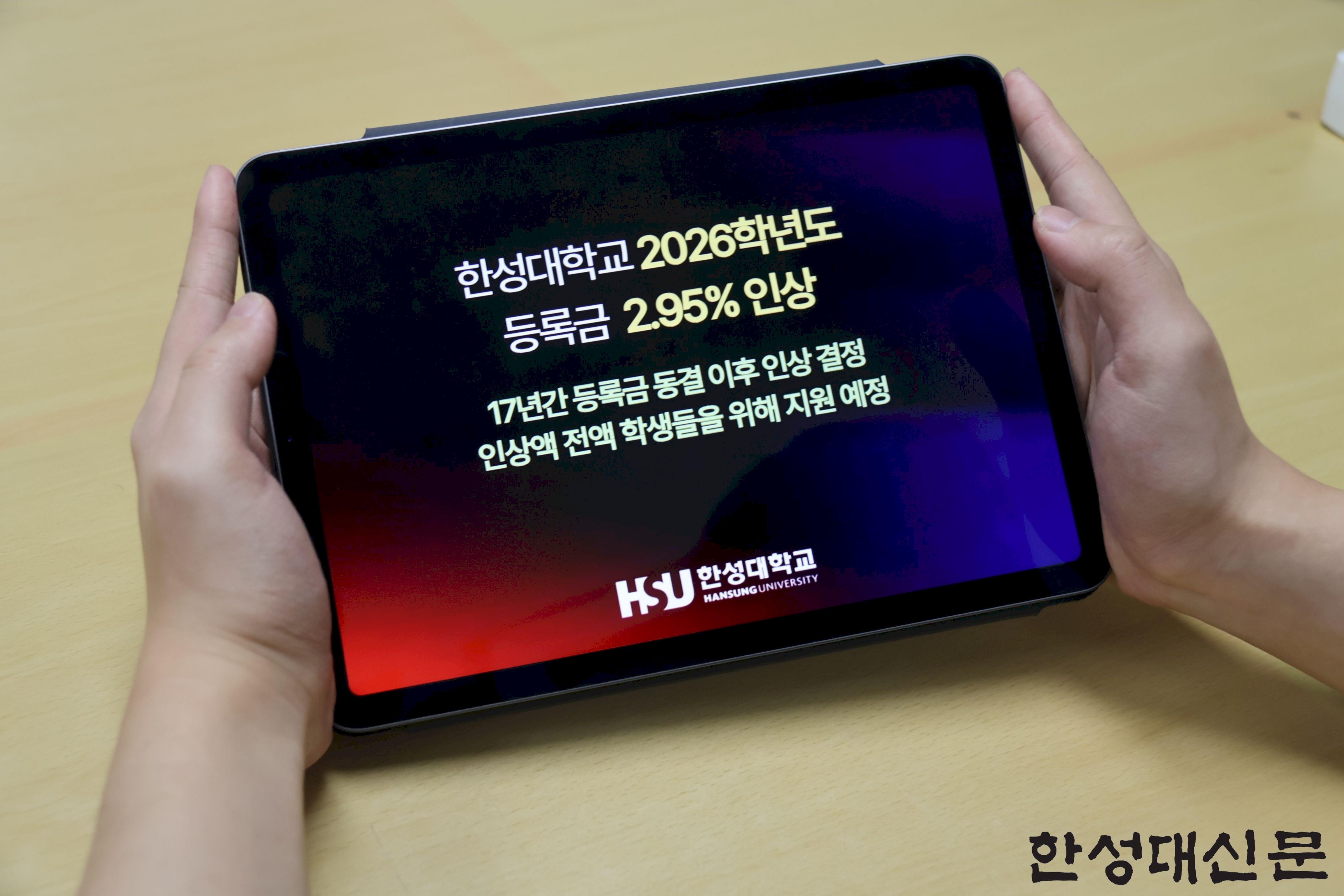 본교 학부 등록금이 17년 만에 2.95% 인상됐다. 등록금 인상으로 확보되는 재원은 2026학년도 기준 약 14억 3천만 원 규모로 ▲교육 인프라 개선 ▲장학금 확대 ▲학생지원비 확대 등에 투입될 예정이다. 김은주 기획조정처장은 등록금 인상분은 학생들의 교육 환경 개선과 실질적 지원 확대에 우선적으로 활용할 계획이라고 밝혔다.