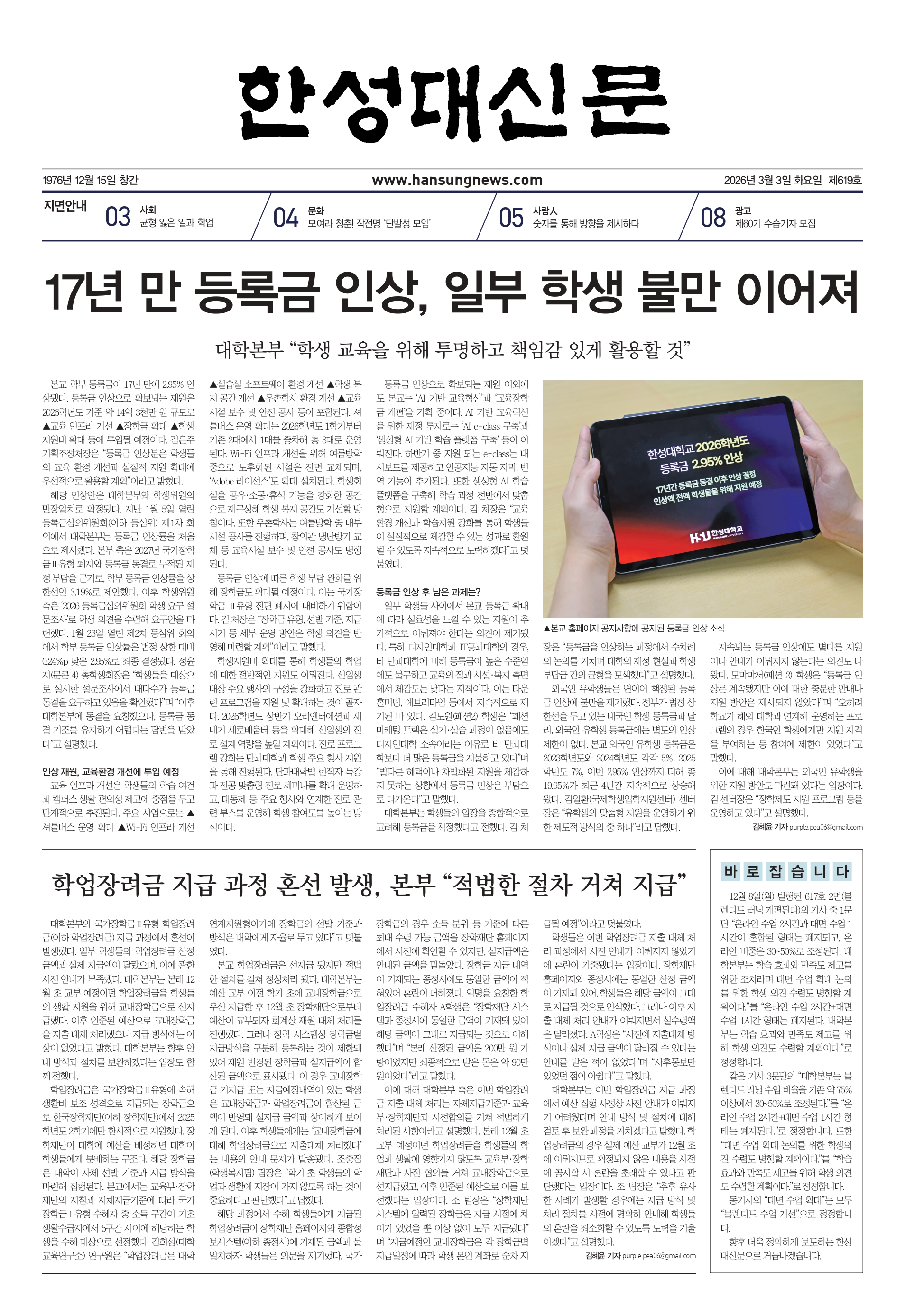 <보도> 17년 만 등록금 인상, 일부 학생 불만 이어져 (한성대신문, 619호)